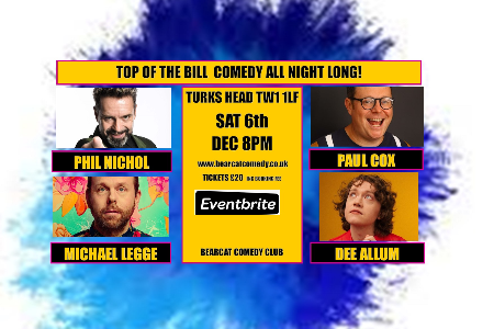 Line up includes: Phil Nichol, Paul Cox, Michael Legge, Dee Alum